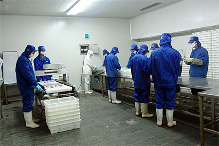 本公司是一家以水產(chǎn)品加工為主的出口型企業(yè),于2004年9月建成并正式投產(chǎn)。公司廠房完全按照歐洲聯(lián)盟的標(biāo)準(zhǔn)設(shè)計(jì)施工,目前占地14000平方米,建筑面積8000平方米,其中加工車間1600平方米。公司日速凍能力達(dá)100噸,儲(chǔ)藏庫(kù)容量為5000噸,主要加工蟹類、貝類、頭足類及魚(yú)蝦類水產(chǎn)品,產(chǎn)品銷往日本、東南亞及歐盟地區(qū)。